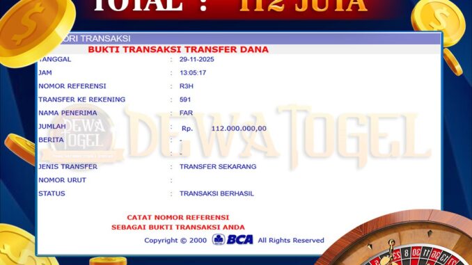 DEWATOGEL mengucapkan selamat kepada user id : GFR*** yang telah berhasil mendapatkan jackpot pada permainan LIVE CASINO DI ROULETTE. Kemenangan sebesar Rp 112.000.000,-. telah dibayarkan LUNAS oleh pihak dewatogel kepada pemilik user id setelah yang bersangkutan mengisi formulir withdraw. Proses pencairan dana berlangsung sangat cepat hanya dalam waktu 5-10 menit sudah berada dalam rekening pemilik user id. Bukti transfer yang dapat anda lihat adalah bukti SAH / VALID yang langsung di dapatkan melalui bukti transaksi dari Bank yang digunakan untuk pengiriman dana pada rekening pemilik user id. Terima kasih kami sampaikan kepada para pengguna setia DEWATOGEL yang telah menggunakan situs kami, sebagai Bandar Terpercaya yang pastinya membayar semua kemenangan member hingga lunas. Apakah DEWATOGEL PENIPU ? Reputasi “DEWATOGEL TERPERCAYA” sudah sangat melekat. puluhan hingga ratusan ribu pengguna setia DEWATOGEL tetap menggunakan situs terbesar dan terbaik di Indonesia ini. Hapus rasa was-was dan khawatir anda, kemenangan anda berapapun PASTI dibayarkan hingga lunas.