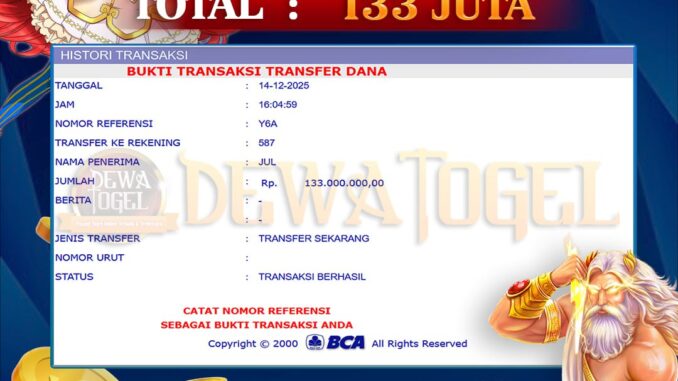 DEWATOGEL mengucapkan selamat kepada user id : GEN*** yang telah berhasil mendapatkan jackpot pada permainan LIVE CASINO DI 24D. Kemenangan sebesar Rp 133.000.000,-. telah dibayarkan LUNAS oleh pihak dewatogel kepada pemilik user id setelah yang bersangkutan mengisi formulir withdraw. Proses pencairan dana berlangsung sangat cepat hanya dalam waktu 5-10 menit sudah berada dalam rekening pemilik user id. Bukti transfer yang dapat anda lihat adalah bukti SAH / VALID yang langsung di dapatkan melalui bukti transaksi dari Bank yang digunakan untuk pengiriman dana pada rekening pemilik user id. Terima kasih kami sampaikan kepada para pengguna setia DEWATOGEL yang telah menggunakan situs kami, sebagai Bandar Terpercaya yang pastinya membayar semua kemenangan member hingga lunas. Apakah DEWATOGEL PENIPU ? Reputasi “DEWATOGEL TERPERCAYA” sudah sangat melekat. puluhan hingga ratusan ribu pengguna setia DEWATOGEL tetap menggunakan situs terbesar dan terbaik di Indonesia ini. Hapus rasa was-was dan khawatir anda, kemenangan anda berapapun PASTI dibayarkan hingga lunas.